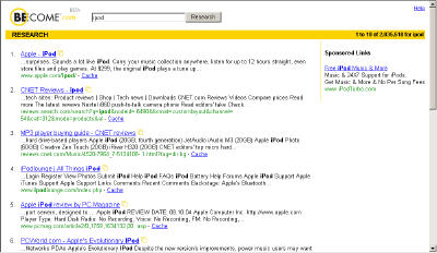 become.com은 현재 beta service 중이며, 다음은 ipod 키워드에 대한 google.com과 become.com의 검색결과 비교이다.