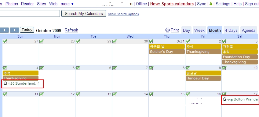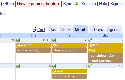 구글 캘린더의 좌측 상단에 “New: Sports calendars”라고 빨갛게 강조되어있습니다.