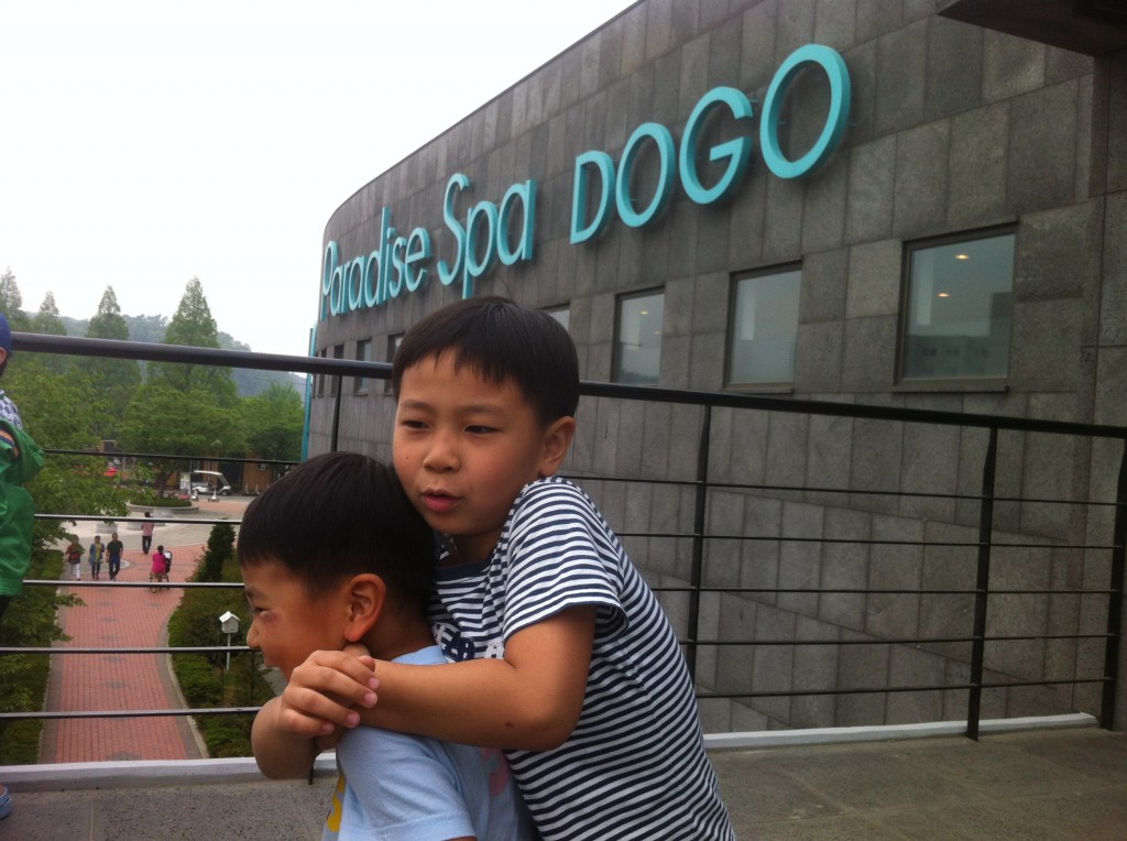 민준이는 구명조끼만 입고서 유수풀 떠다니기를 즐기고, 예준이는 찬물 속에서 미끄럼틀을 타느라 정신이 없다.