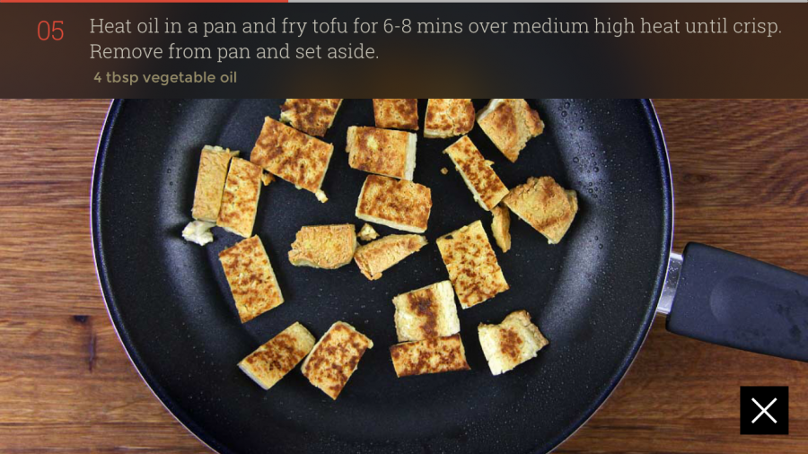 - 식용유에 두부를 넣고 6-8분 동안 강불에서 익혀 겉을 바삭하게 굽는다.