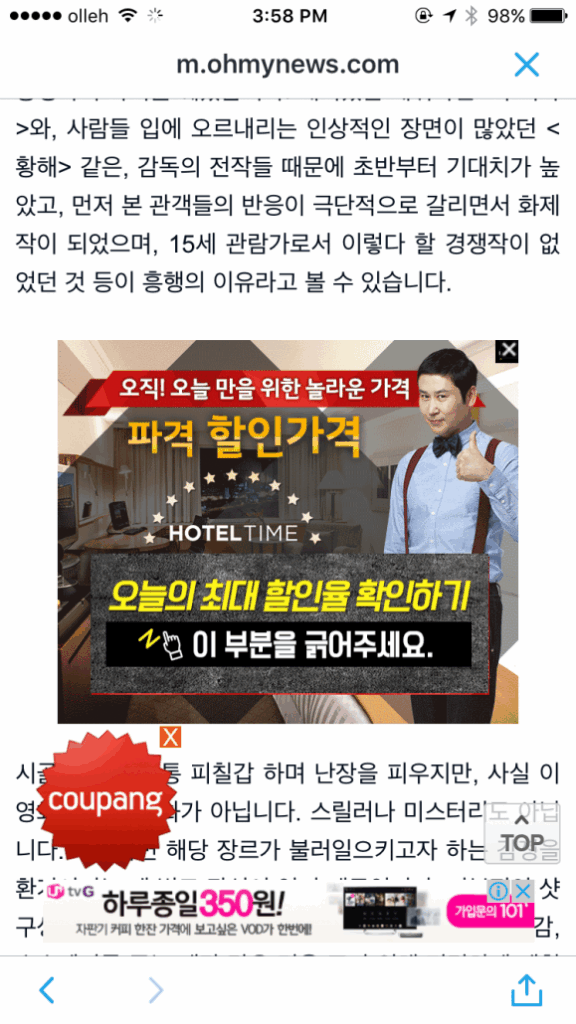• 좌하단의 동그란 배너는 계속 기사를 가린 채 따라다니고, 광고를 없애기 위해 x버튼을 눌러도 두번에 한번은 광고 사이트로 넘어가 버렸다.