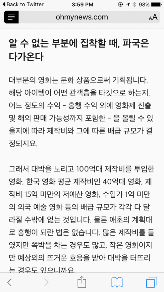 • 일단 사파리 브라우저로 내보내기를 선택하고, 사파리 브라우저 상단에 있는 ‘읽기 도구’ (URL 입력 창 왼쪽 끝에 삼선)를 누른다.