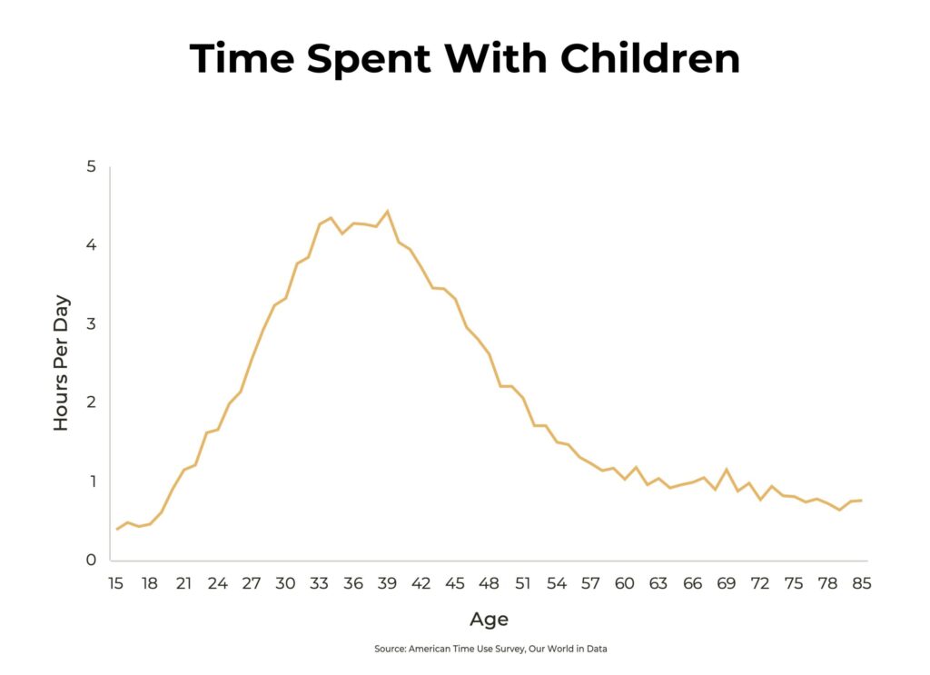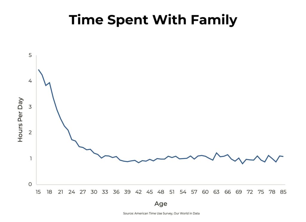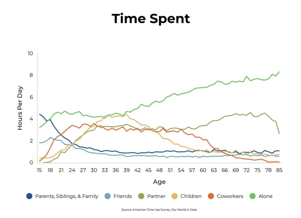가족 및 자녀와 보내는 시간이 줄어드는 대신 혼자 있는 시간이 늘어납니다. 평생 동안 꾸준히 증가합니다.
