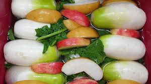 - 실온에서 2~3일 정도 발효시킨 뒤 냉장 보관하며 한달 후에 꺼낸다. 통무는 숙성이 느리므로 조금 더 기다려야 제맛이 난다.
